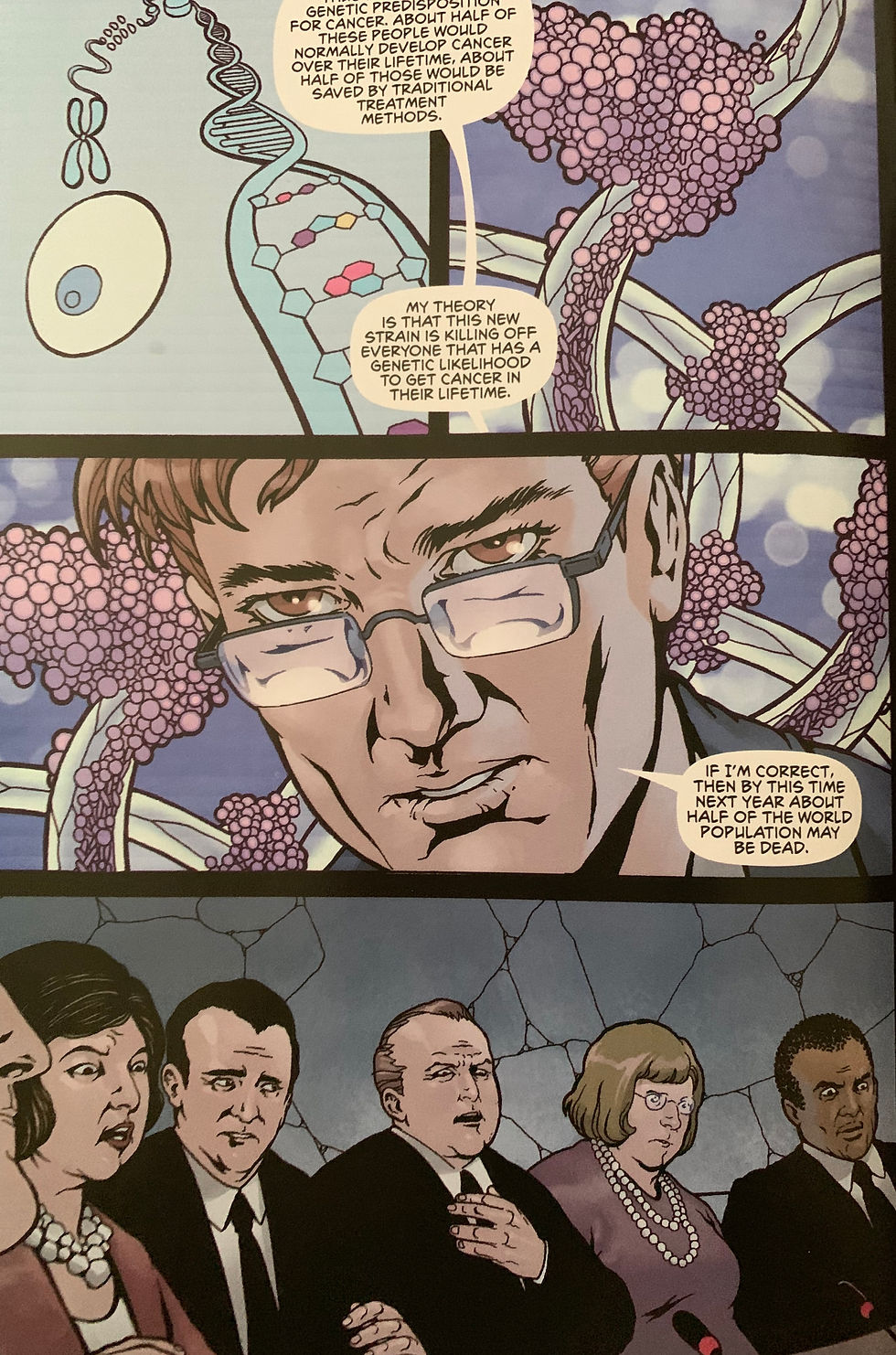 After the death of his wife, Jack throws himself into his work and enlists his father's support in continuing to raise his daughter. I think it’s interesting that both men have lost their wives and I don’t mind that direction, it shows a more passionate side to the men in this story, as his dad takes on the roll of caretaker and instructs his son to grieve and feel all of the emotions that come with losing his wife. The way their relationship is painted in the first few pages are kind of beautiful to me, especially being that the father is a military man and a US ambassador. We find out that the father has also lost his wife to this viral wave and that gives us the backdrop for why Jack is so hellbent on solving the problem, aside from a decent portion of the population being taken out by it.