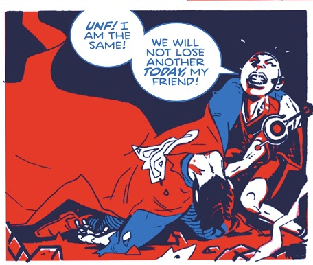 The art across the board is fantastic, using the limited color palette exceptionally well to showcase the appropriate elements in each story. Ridley, Henry, and Bellaire's story in particular uses the two colors extremely well to punctuate the good as bllue, that bad red or the red of violence.
